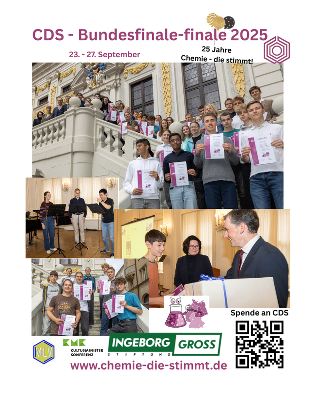 "Chemie - die stimmt!", kurz CDS, bietet Schülerinnen und Schülern der 8. bis 10. Klassenstufen einen Einstieg in die faszinierende Welt der Chemie. CDS ist seit 2021 ein von der KMK-empfohlener Wettbewerb und wird bundesweit ausgetragen.