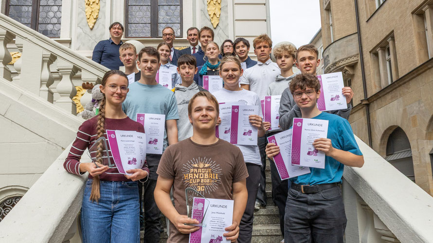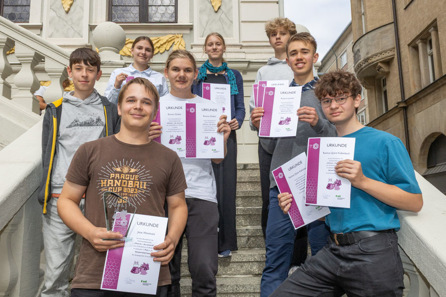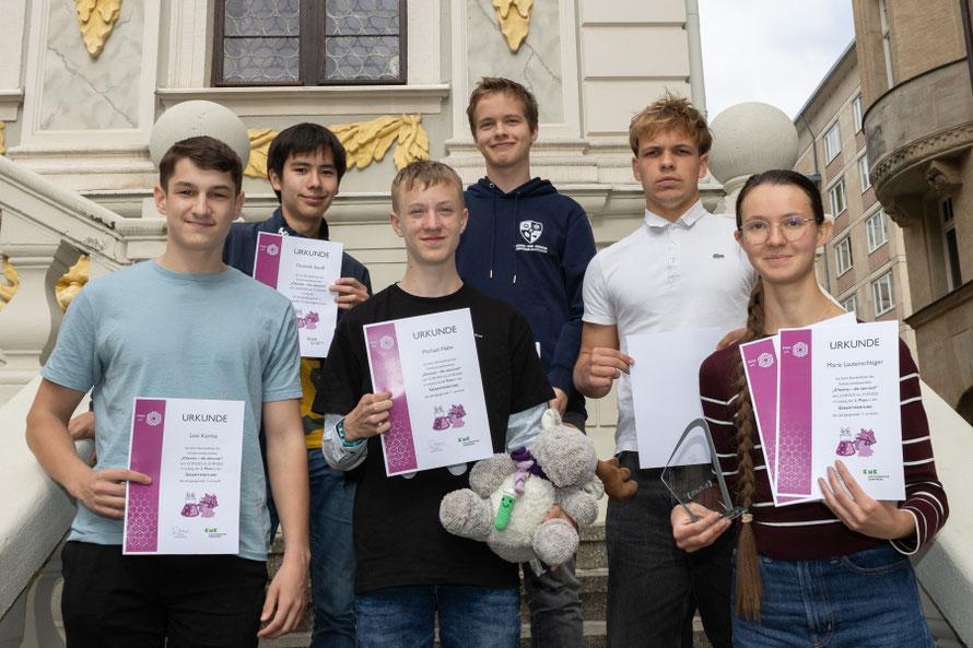 Bundesfinale 2024/25: alle Prämierten und die Laudatoren v.l.n.r. Jan Rossa (Wettbewerbsleiter), Uwe Schmidt (LaSuB), Jan Riedel (Bildungsminister des Landes Sachsen-Anhalt) und Frau Prof. Dr. Brigitte Latzko (Prorektorin der Uni Leipzig); Foto: Jan Bandemer