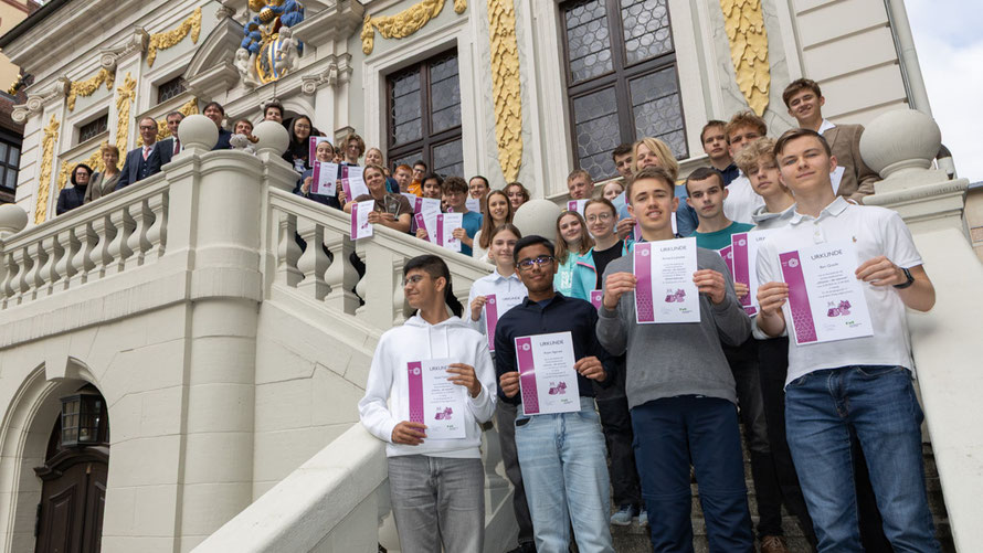 Bundesfinale 2024/25: alle Teilnehmenden und die Laudatoren v.l.n.r. Frau Prof. Dr. Brigitte Latzko (Prorektorin der Uni Leipzig), Sozialbürgermeisterin Dr. Martina Münch, Uwe Schmidt (LaSuB), Jan Riedel (Bildungsminister des Landes Sachsen-Anhalt) und Jan Rossa (Wettbewerbsleiter); Foto: Jan Bandemer